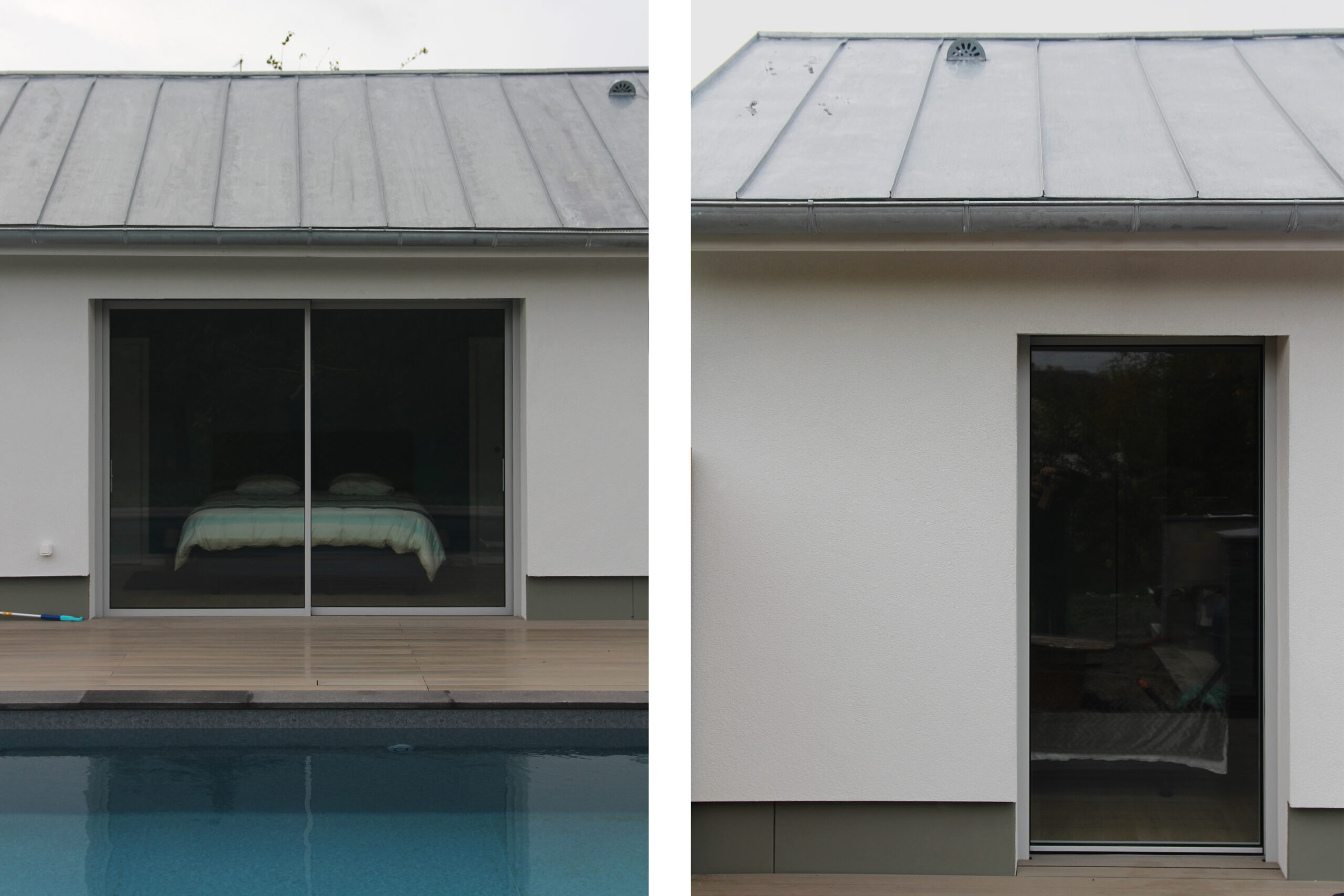 Le parti pris des façades est de valoriser la situation de l’ancien atelier en créant des vues et des transparences avec le jardin qui l’entoure. Ainsi les façades Nord, Sud et Ouest sont largement ouvertes grâce à des menuiseries toute hauteur. Deux ouvertures seront plus généreuses au Nord et au Sud pour connecter les espaces de salon vers le jardin et la terrasse Nord. Le matériau choisi (aluminium gris clair) garantira la durabilité des menuiseries tout en rappelant le zinc des toitures. Pour l’occultation de ces menuiseries, des volets roulants seront intégrés dans le complexe d’isolation extérieur des façades (de manière à rendre leur boitier invisible).