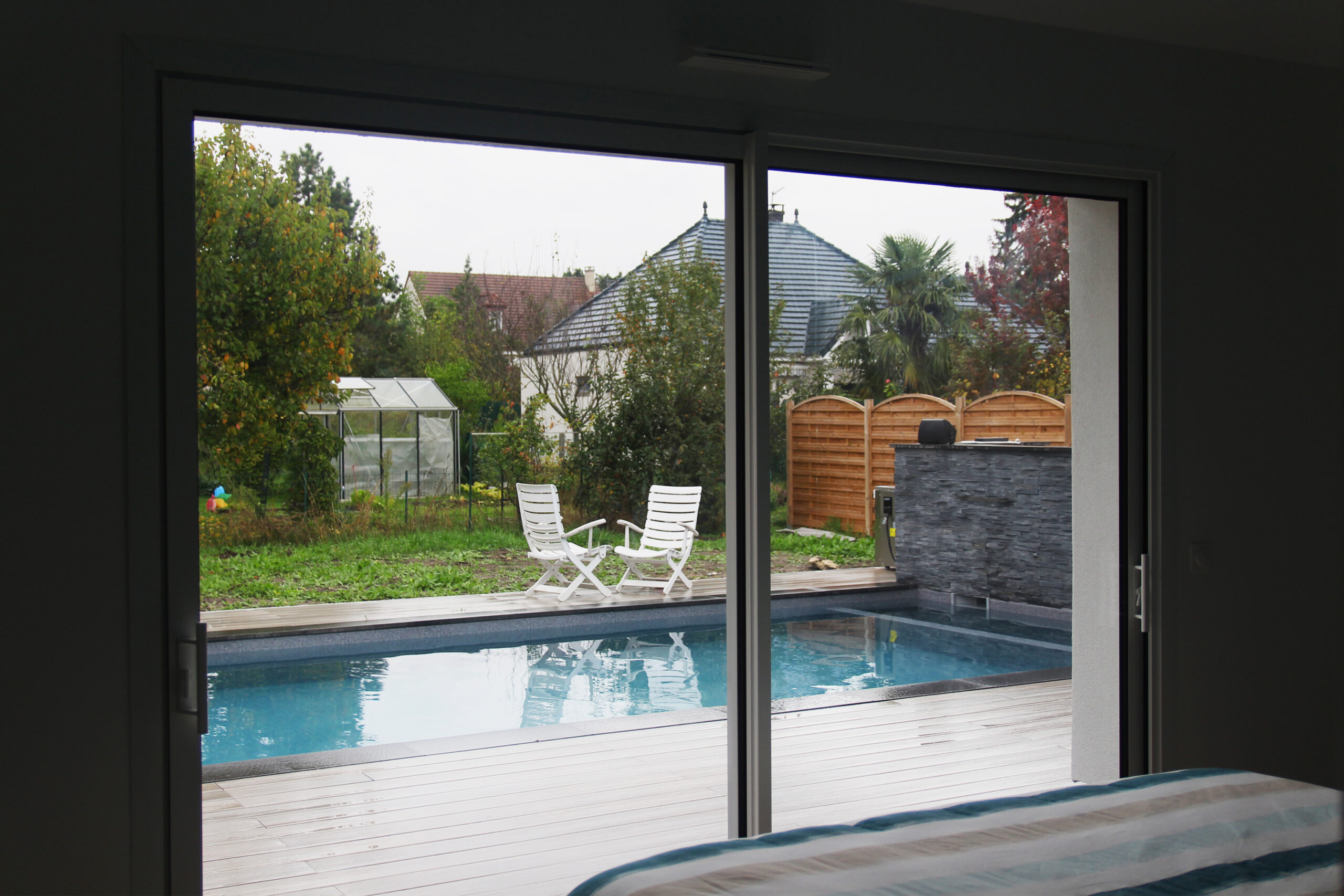 Le projet de piscine enterrée s’implante dans le jardin côté Nord. . Une terrasse en bois, lattes ajourées, s’implante autour du bassin. Elle sera posée au niveau du sol naturel (sans marche). Le coffret technique de la piscine sera intégré dans un volume habillé. Il s’implante dans la continuité de la piscine et de la terrasse.