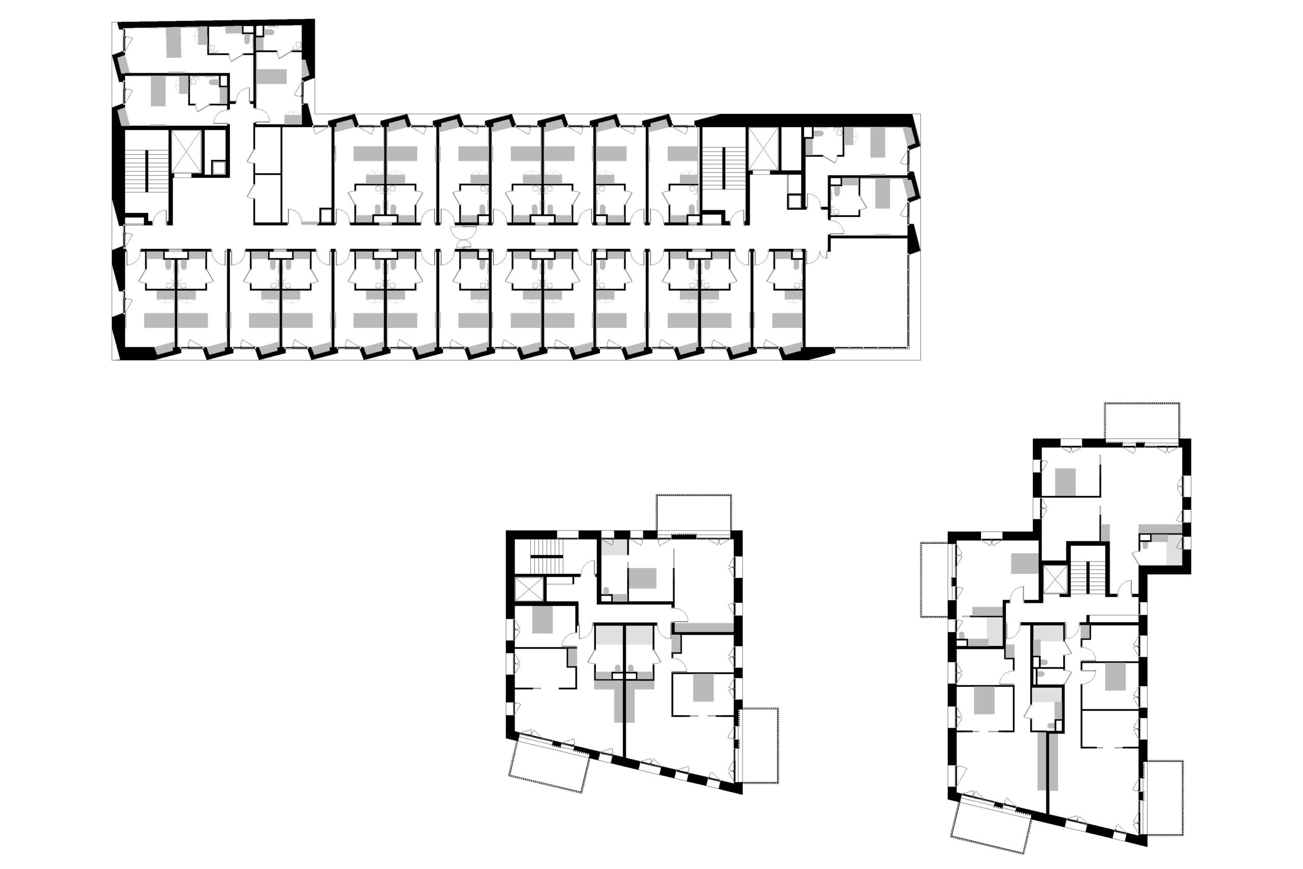 La mise en relation entre les trois bâtiments se distingue autant par les matériaux que par les couleurs de façade. Ce traitement non uniforme confère une échelle plus intermédiaire au sein de l’ilot.