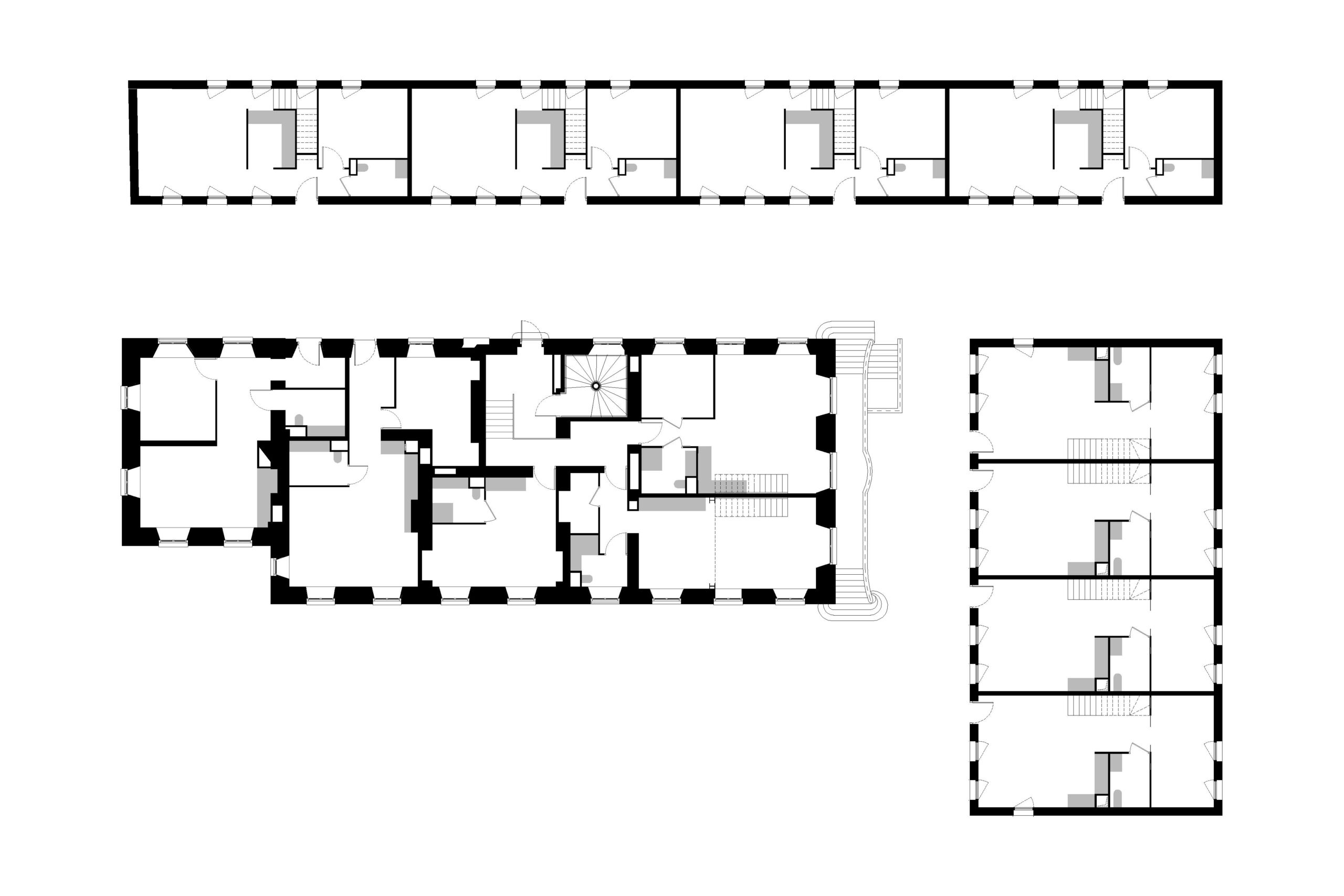 L’écriture des petites maisons en bande marque notre volonté de construire et composer une hiérarchie. Le bâtiment existant, par sa hauteur et son positionnement central domine les nouvelles constructions plus basses. L’écriture minimale des maisons favorise la lisibilité entre ancien et nouveau et cela à partir de deux éléments : la verticalité affirmée et continue des baies et l’unité dans la nature et la couleur du ravalement des façades.